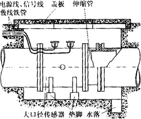 由于大口徑管道在多數(shù)場合下是埋在地下的,因此大口徑傳感器在安裝前應(yīng)做好水泥地坑。圖6-19所示是在給排水系統(tǒng)中常見的安裝形式。水泥地坑應(yīng)有足夠的活動空間,側(cè)壁埋有敷設(shè)電纜的鋼管,上有蓋板防止雨淋,下有泄水管以免坑內(nèi)積水而使傳感器侵水。為了拆裝方便,傳感器應(yīng)放在墊腳上,且在下游側(cè)裝有活絡(luò)的伸縮管。圖6-20是電磁流量計(jì)在地下水泥管污水排放系統(tǒng)中的安裝實(shí)例。