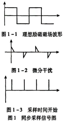 在現(xiàn)行的電磁流量計設計中,低頻矩形波勵磁結合了直流勵磁和交流勵磁的優(yōu)點,成為主要勵磁方式之一。在低頻勵磁方式下其干擾主要表現(xiàn)為:由勵磁電流突變產(chǎn)生的微分干擾信號。理想勵磁磁場信號如圖1-1所示,為低頻矩形波,實際上隨著勵磁電流變化(dI/dt)磁場上產(chǎn)生微分干擾信號,如圖1-2,可以看到隨著電流的穩(wěn)定,干擾信號隨之消失,因此同步采樣技術可以有效抑止微分干擾信號。實際設計中模數(shù)轉化器使用AD公司的24位sigma delta模數(shù)轉化器AD7714。AD7714可以分別采用硬件和軟件方式進行采樣開始時間控制從而實現(xiàn)同步采樣。采用軟件方式時,當控制寄存器中FSYNC位為邏輯1時,模數(shù)轉換器處于復位狀態(tài);向該位寫邏輯0時,器件開始采樣輸入信號。在應用中,低頻勵磁信號由MSP430單片機內(nèi)部定時器產(chǎn)生,同時產(chǎn)生采樣信號。如圖1所示,采樣開始時間滯后勵磁信號1/4個周期。
