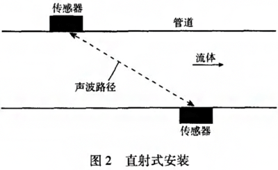 直射式安裝時(shí),一組換能器安裝在管道的對側(cè),這種安裝方式超聲波聲束的聲程zui短,可以提高信號(hào)強(qiáng)度,當(dāng)管道和液體的聲導(dǎo)性能差時(shí),要考慮使用直射式安裝。如圖2所示。