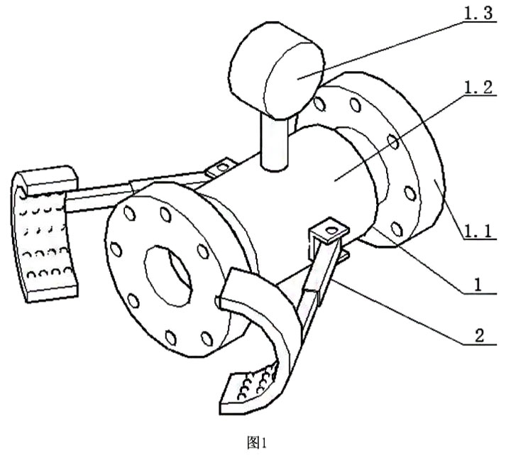 圖中標號:電磁流量計主體-1;法蘭盤-1.1;測量導管-1.2;轉換器-1.3;定位裝置-2;U型連接組件-2.1;可轉動伸縮桿-2.2;夾持弧形件-2.3;滾珠-2.3.1。
