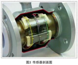 其中B、D、S為常量,流量與感應電動勢U成正比關系,因此,測得感應電動勢U,即可得到流體流量。由此可見,電磁流量計正常運行需要有穩定的磁場,而磁場正是靠傳感器線圈內的勵磁電流來產生的。勵磁線圈如圖2所示。對線圈對稱安裝在傳感器正對的兩側,以產生均勻的磁場,傳感器剖面圖如圖3所示