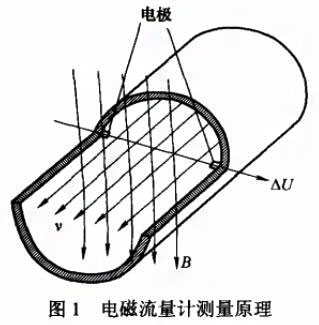 電磁流量計測量原理如圖1所示,管道內(nèi)流動的導(dǎo)電液體切割磁力線,將在兩端電極間產(chǎn)生電勢差ΔU,ΔU與磁通量密度B、液體流速ν符合弗來明右手定則。只要管道內(nèi)部流場理想、磁場穩(wěn)定,△U的大小與管道內(nèi)介質(zhì)平均流速成嚴格的線性關(guān)系,從而通過測量ΔU的大小可確定管道內(nèi)介質(zhì)流量。