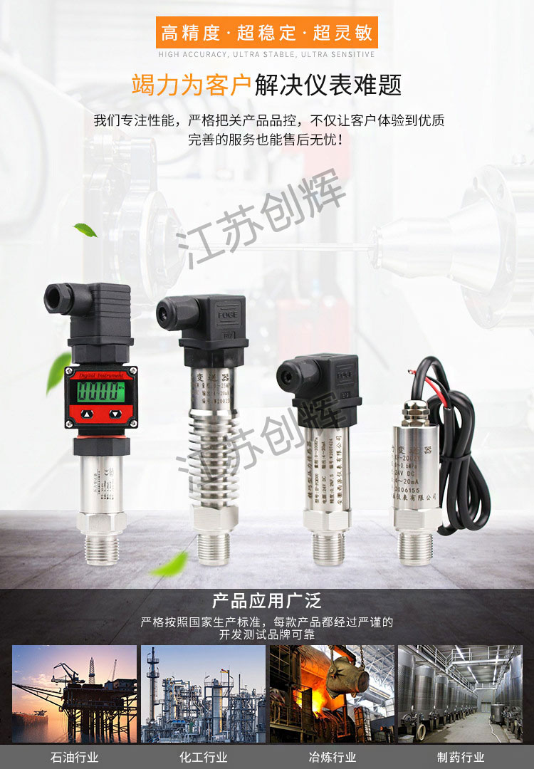 精巧型壓力變送器,采用金屬擴(kuò)散硅傳感器,金屬的延展性、精度及各方面的綜合指標(biāo)是很多其他類型傳感器無可比擬的。傳感器選用美國GE集團(tuán)NOVA公司進(jìn)口壓力傳感器或者M(jìn)ICROSENSOR公司合資壓力傳感器,產(chǎn)品由高精度傳感器和高集成化電子線路及不銹鋼外殼組成。**應(yīng)用于空調(diào)設(shè)備、恒壓供水、自動(dòng)化控制、空壓機(jī)、制冷設(shè)備、水處理系統(tǒng)、液壓系統(tǒng)、工程機(jī)械、發(fā)酵罐過程檢測(cè)等。
